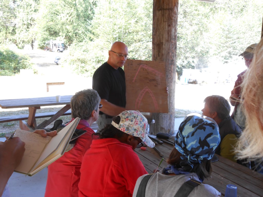 He demonstrated with some stone from my cobble pile. He split a 7-9" basalt egg shape, a 6-7" peridotite river cobble, and attempted to split a 9-10" dunite (olivine) river rock with lots of river damage but instead, due to the nature of dunite, he ended up working its core surfaces.
